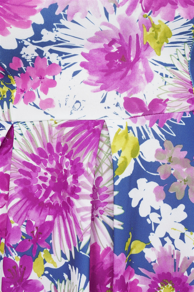 pea green purple blue and white watercolor floral print, pleated waist, sleeveless, round neck, mini lenght, casual, chic, office wear, bust darts, unlined, super stretchy.