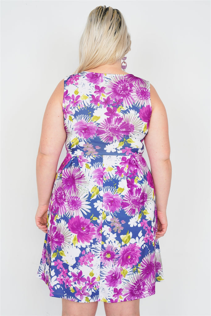 Plus Size Purple Navy Watercolor Floral Print Casual Midi Dress
