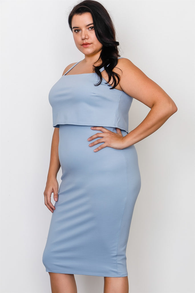 sleeveless, flounce layered neckline, back zipper closure, solid, unlined, midi length, bodycon.