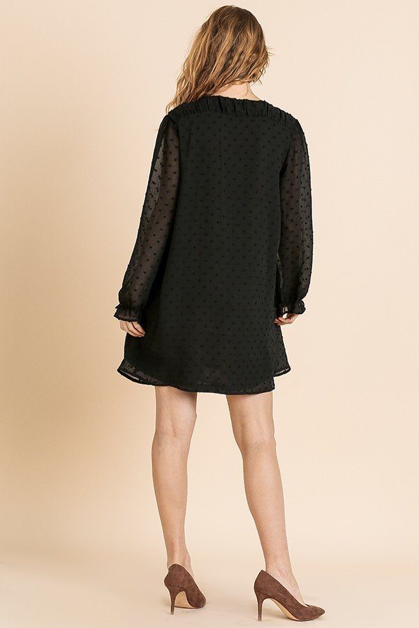 Sheer Polka Dot Fabric Long Ruffle Sleeve V-Neck Dress with Lining and Gathered Neck Detail