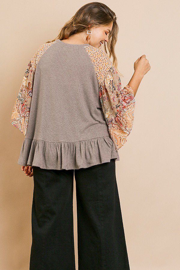 Floral Paisley Mixed Print Bell Sleeve Waffle Knit Top with Ruffle Trim