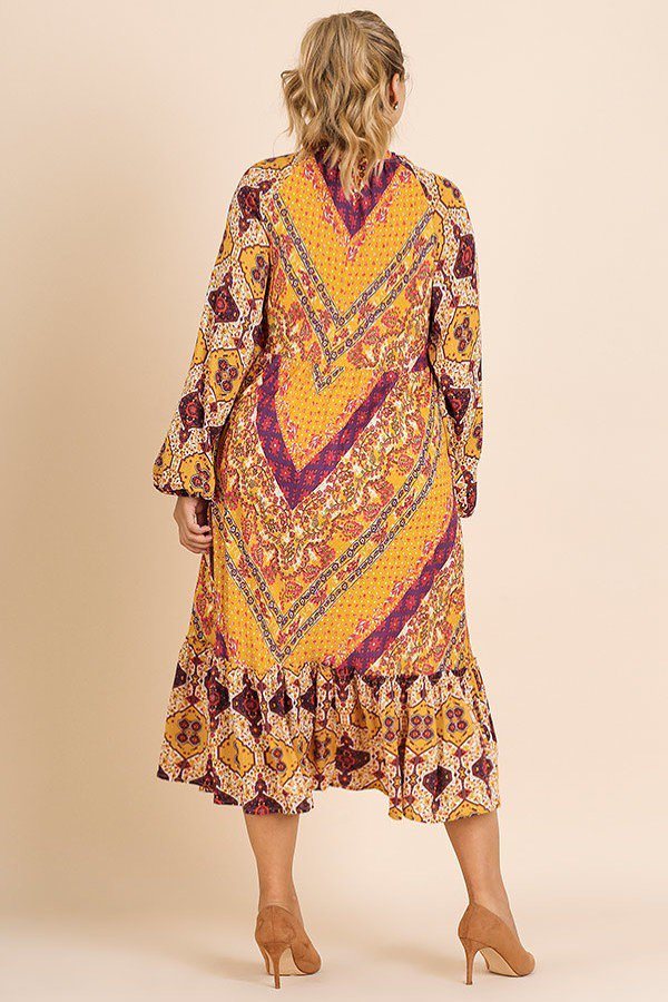 Scarf Mixed Print Long Puff Sleeve Keyhole Maxi Dress