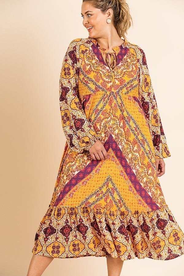 Scarf Mixed Print Long Puff Sleeve Keyhole Maxi Dress with Neck Tie and Ruffle Hem