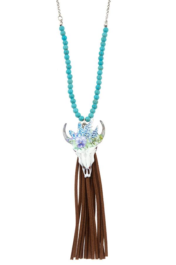 ETCHED BULL SUEDE TASSEL BEADED LONG NECKLACE SET